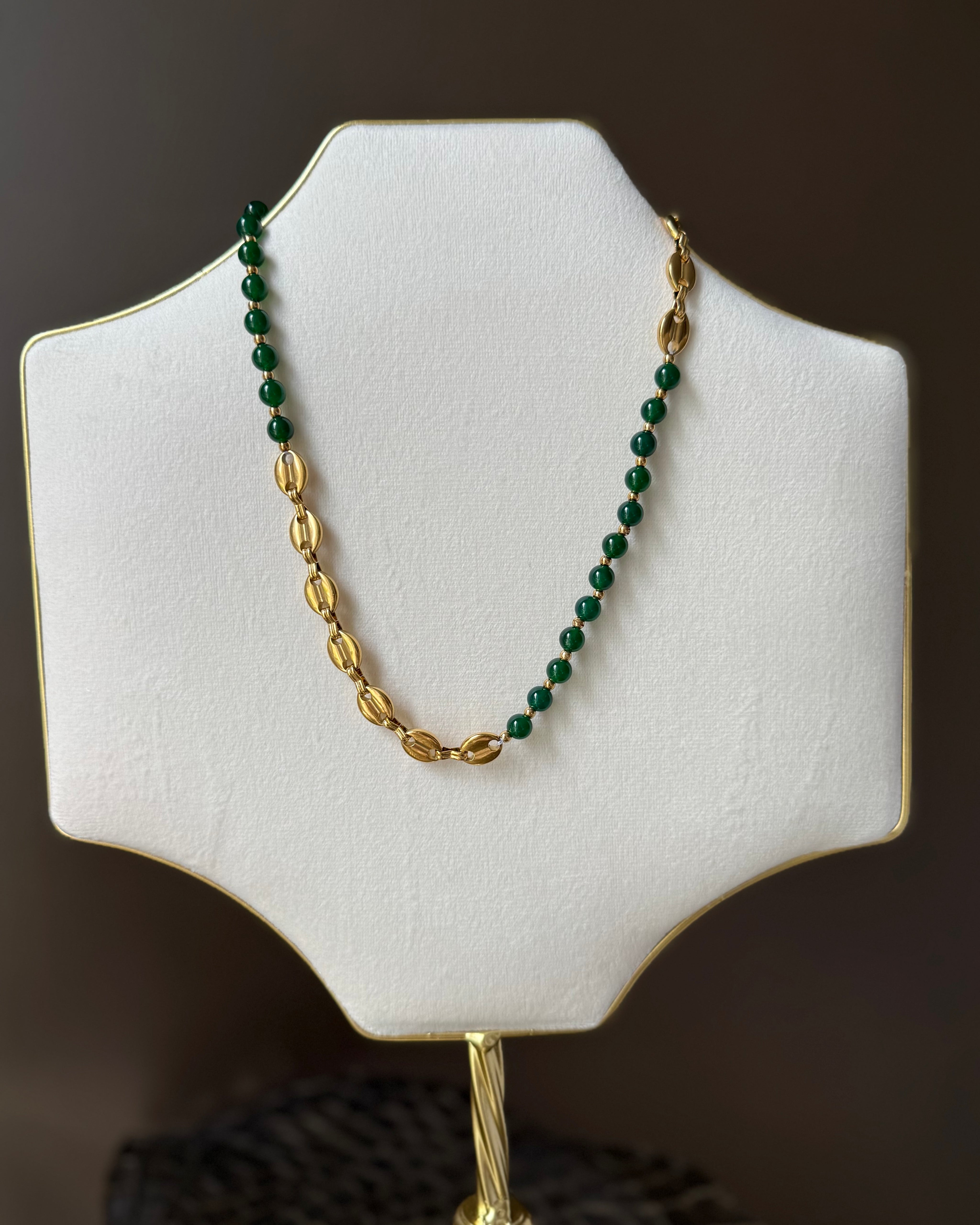 This necklace features a beautiful combination of deep green beads paired with elegant gold-toned oval links for a refined, modern look.