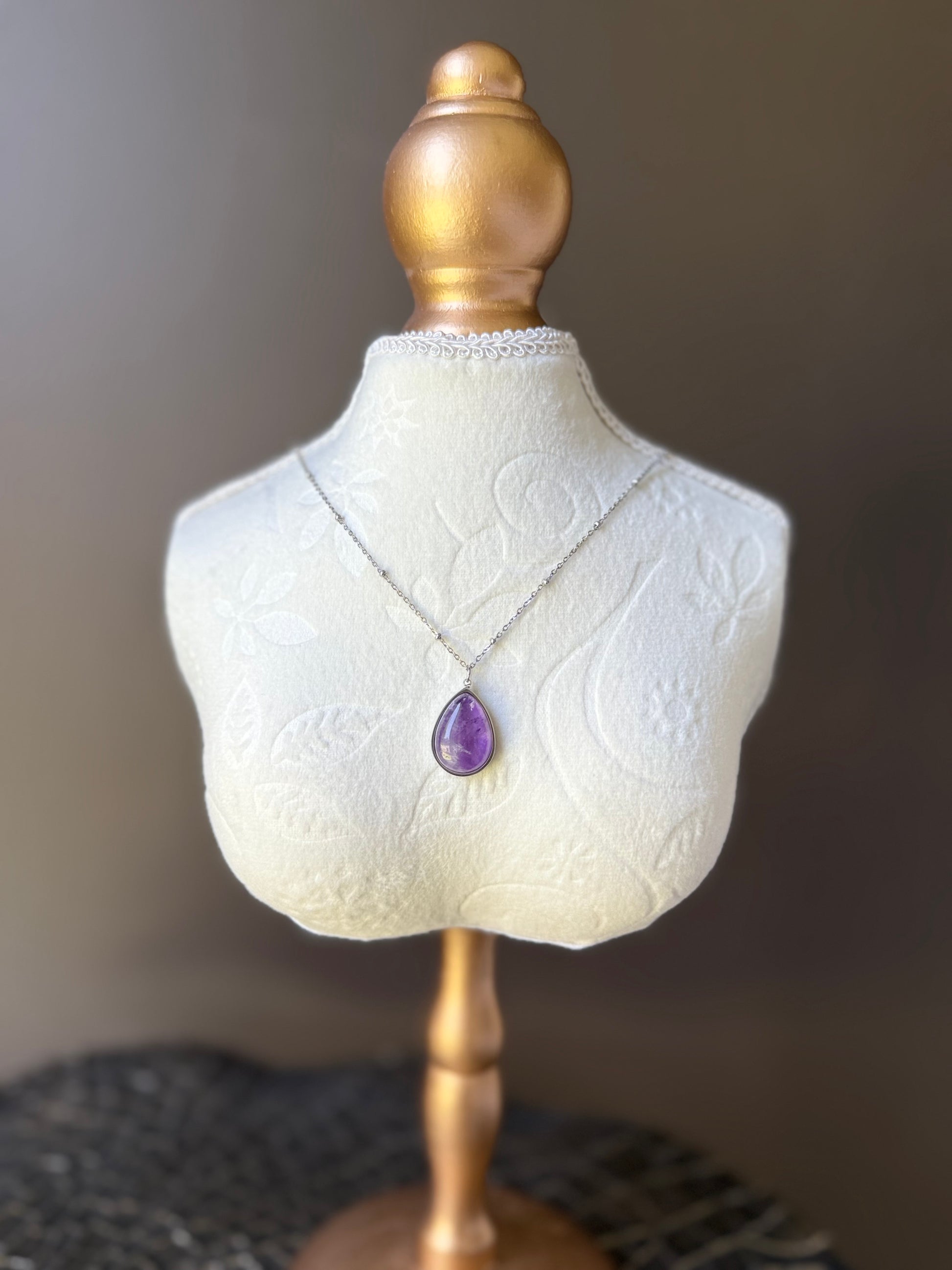 A silver-tone necklace features an oval purple gemstone set in a simple, elegant frame.
