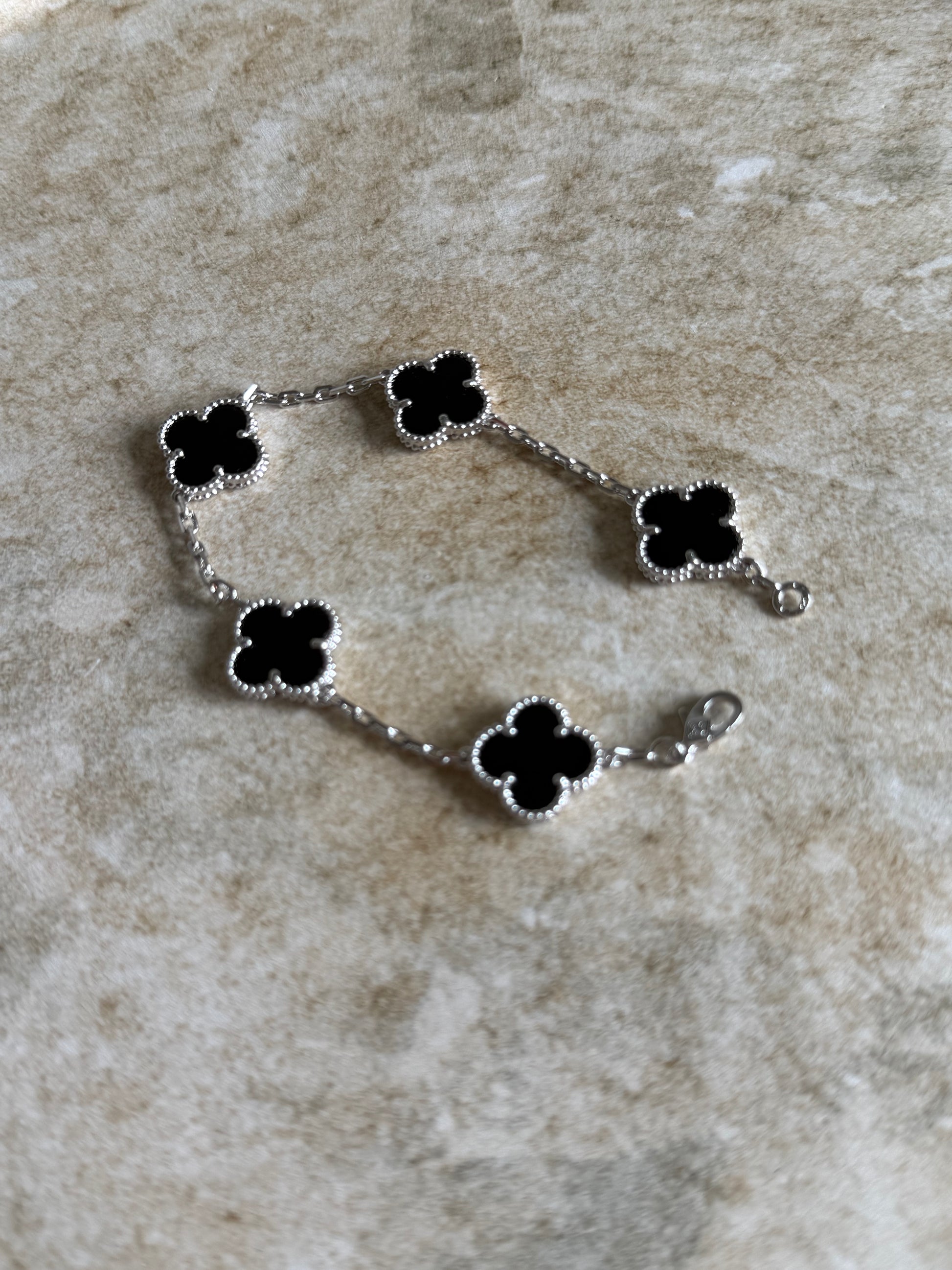 This bracelet features elegant, silver-tone chain with VK Black flowers style, luxurious look. Its modern design and adjustable clasp make it a chic accessory for both everyday wear and special occasions.