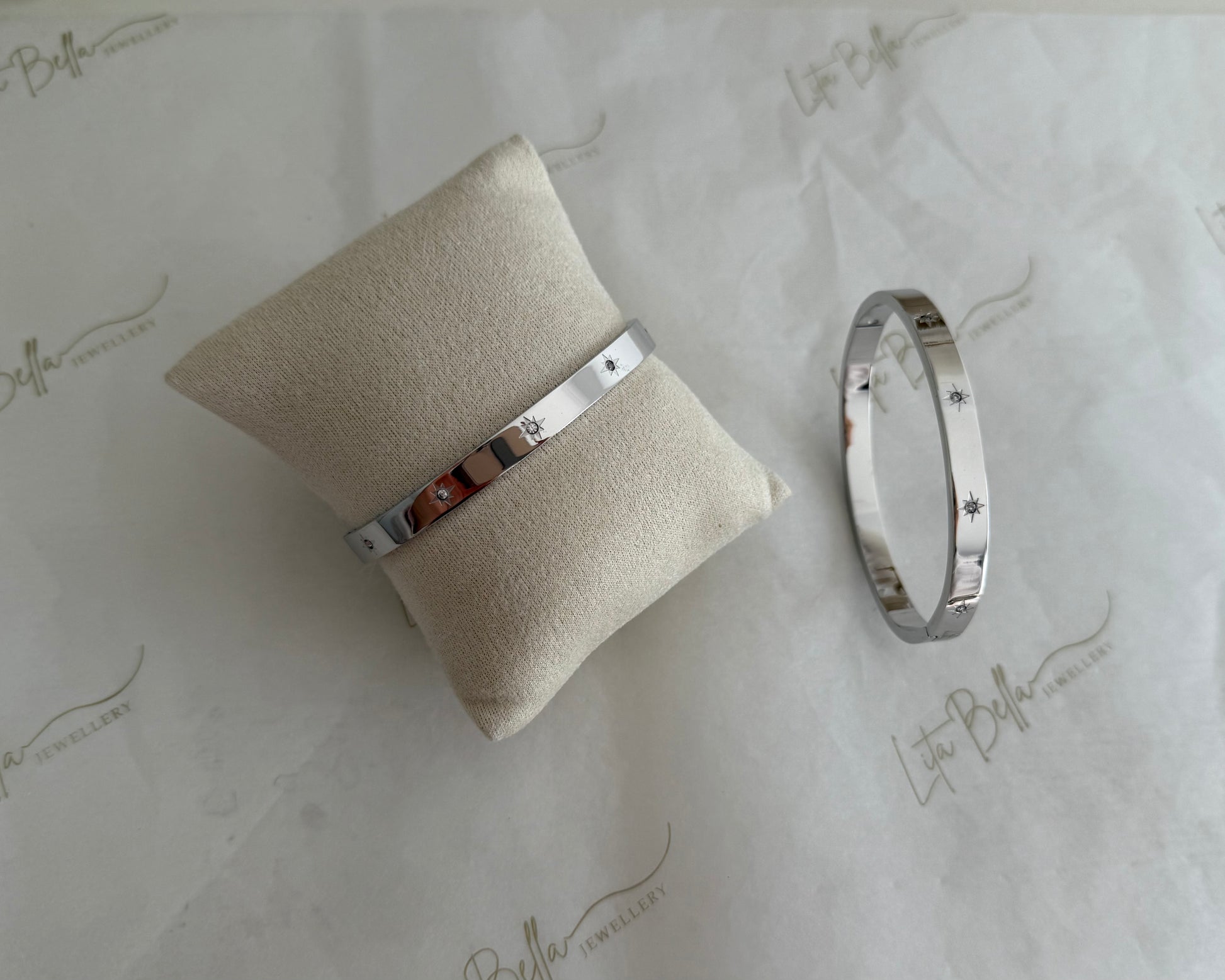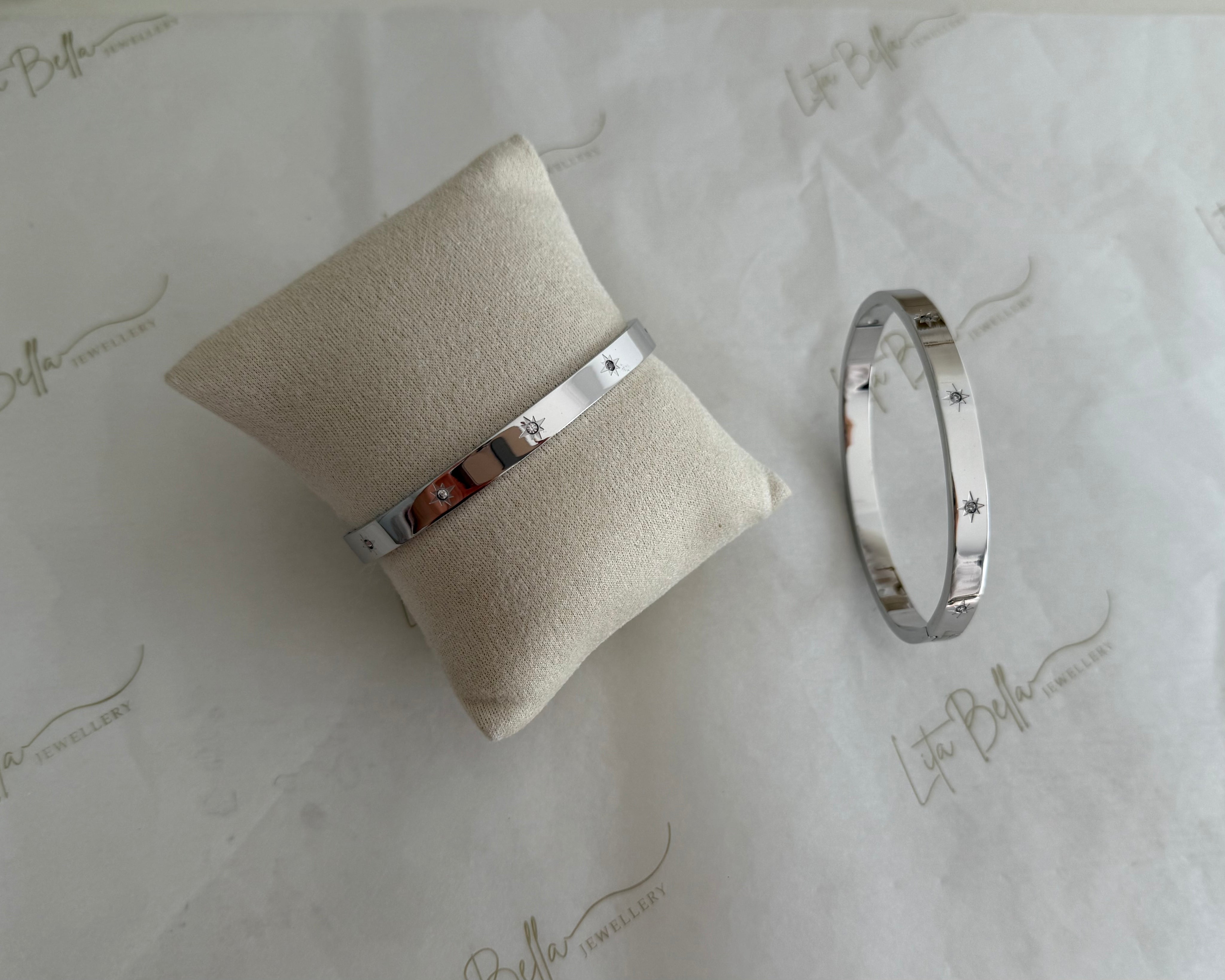 A sleek silver bangle adorned with delicate star-engraved details and sparkling crystal accents.